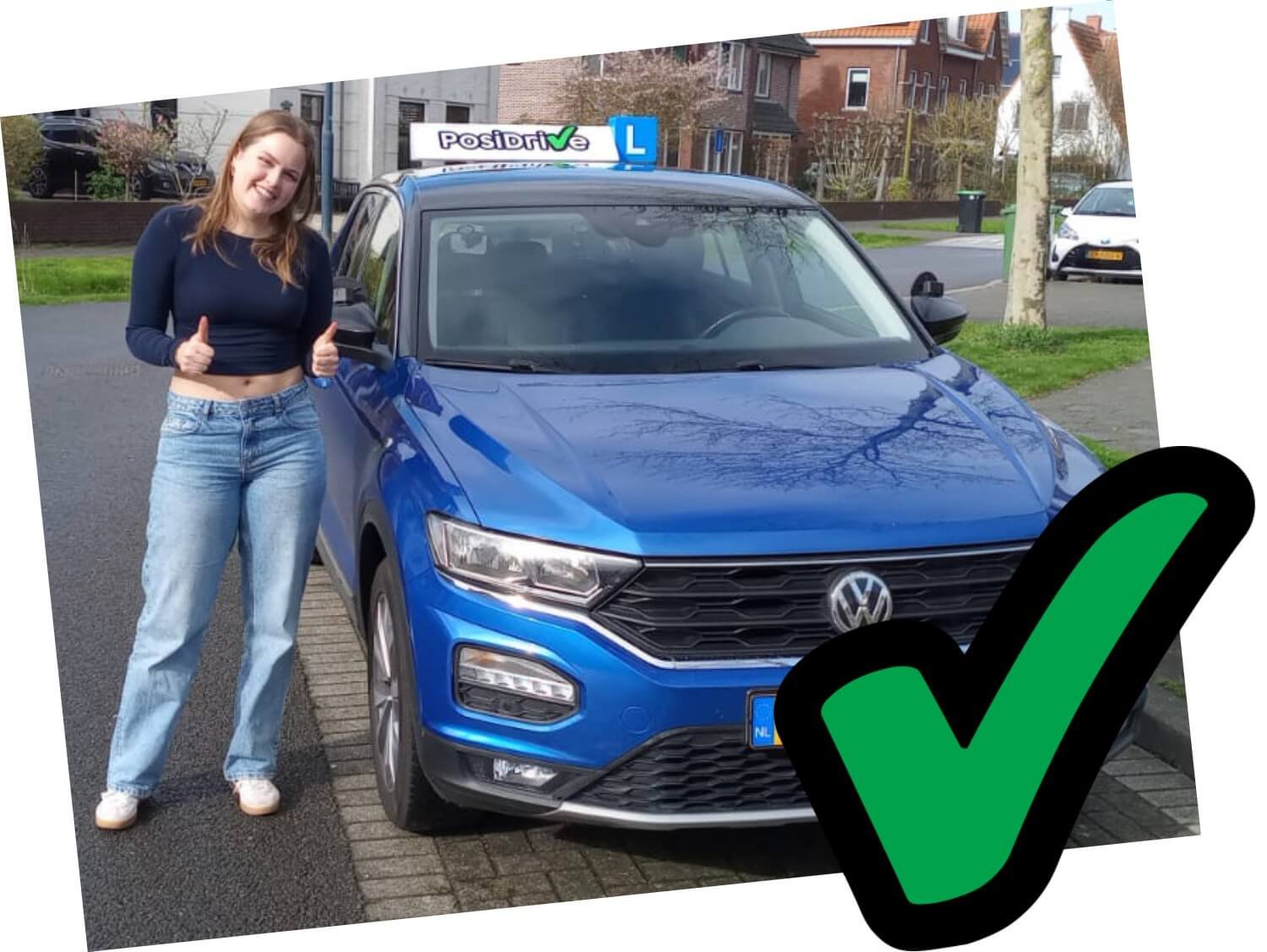 Gefeliciteerd Esmay, geslaagd voor je rijexamen. Keurig gedaan. Examen doen was misschien niet je ding. Maar in de les ging het veel relaxter. En vandaag liet je dat ook zien op je examen. Heel veel plezier met je rijbewijs. Kun je nu op zoek naar een eigen auto. Veel plezier